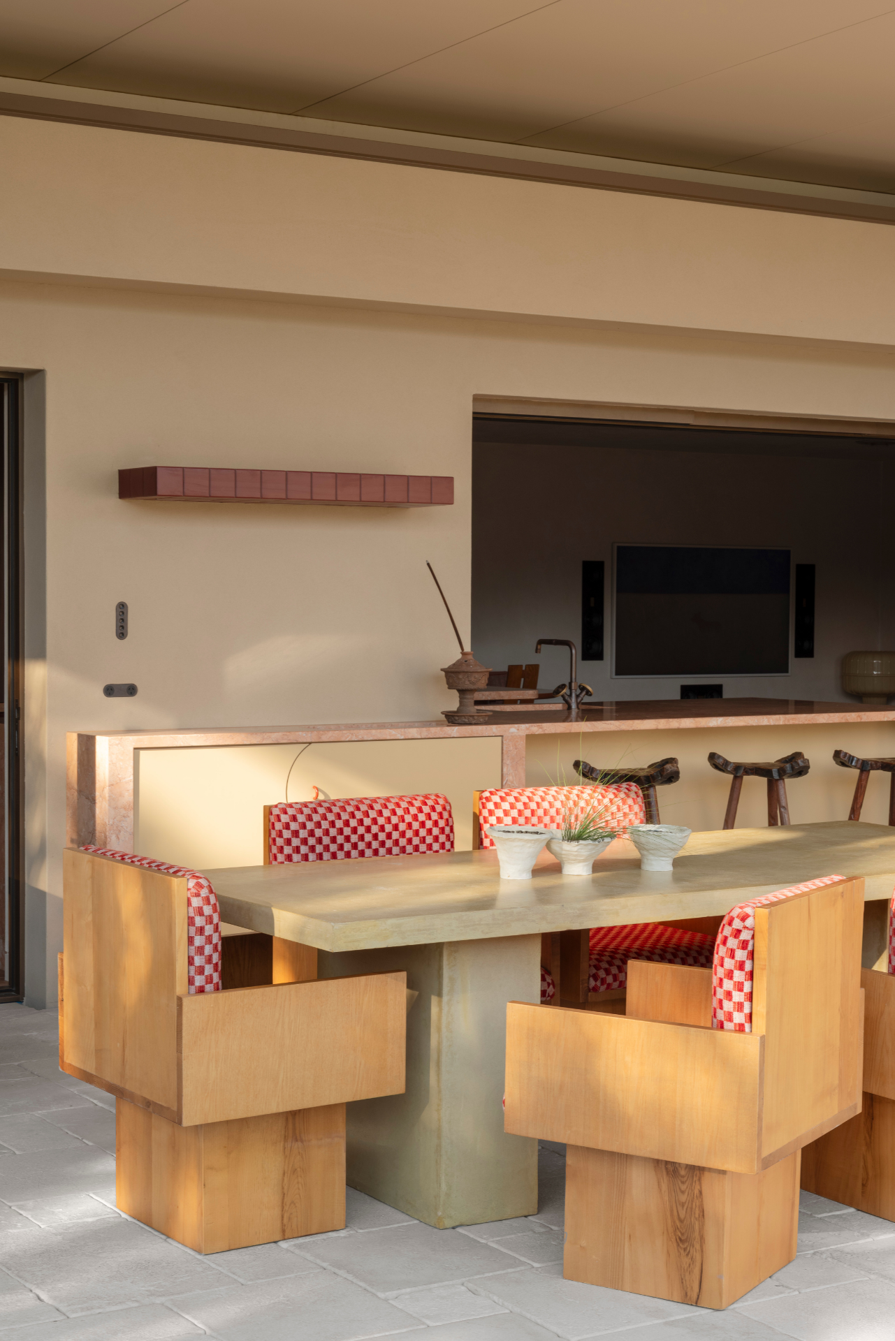 Fleur Studios furniture designs feature throughout the residence, selected to complement the architecture and material palette. The Elio Dining Chair, Cleo Stool, Beau Bench Seat and Marni Vase are some of the designs selected to accompany the home.