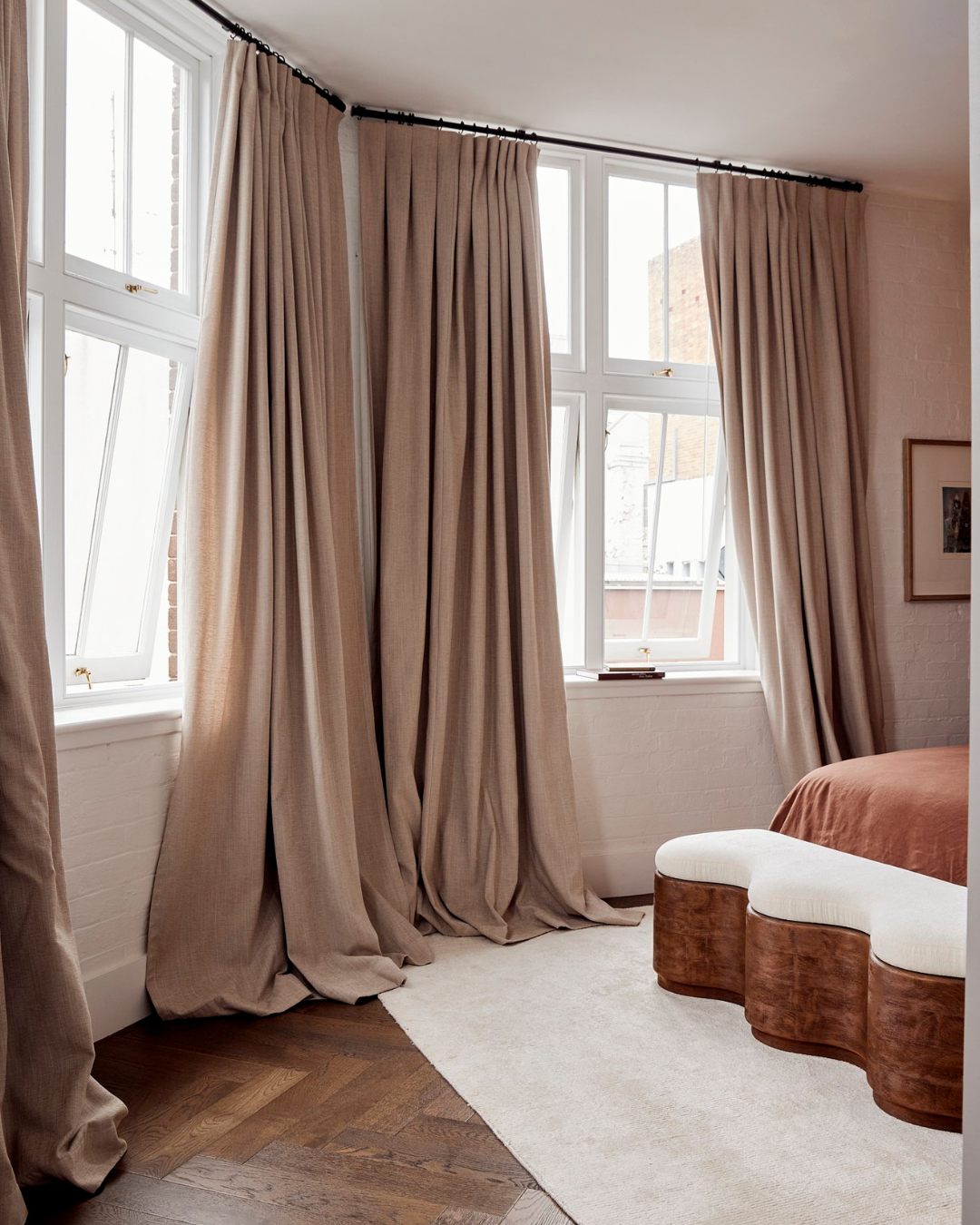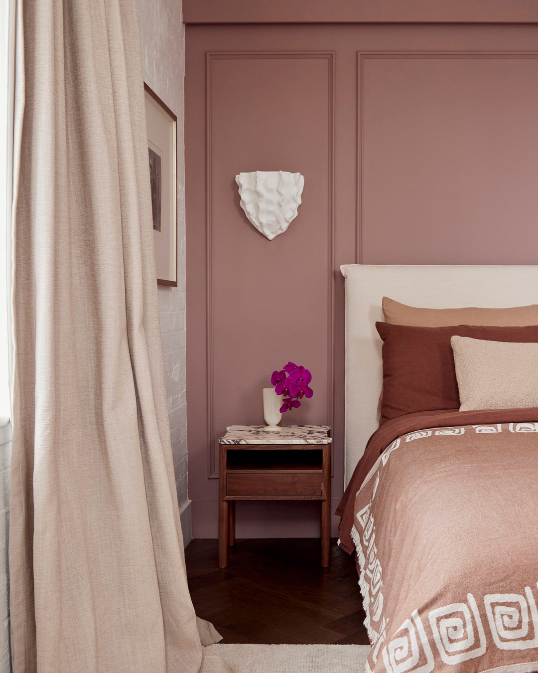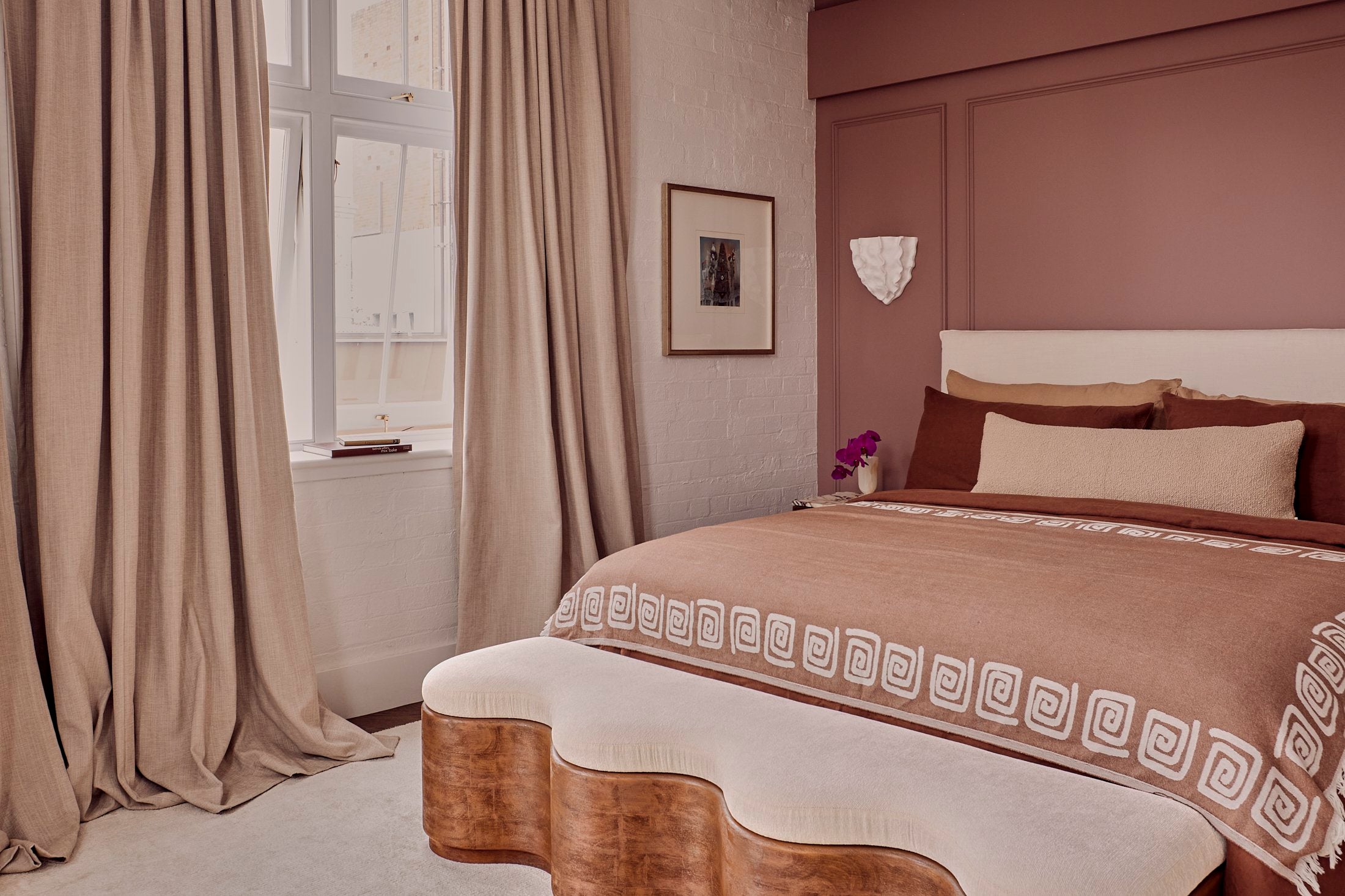 The beautiful master bedroom features our Naomi Nightstand in solid walnut timber paired with a Calacatta Viola marble top. The marble, walnut timber, herringbone flooring, and opulent draped curtains make this room effortlessly sophisticated while maintaining a distinct personality.