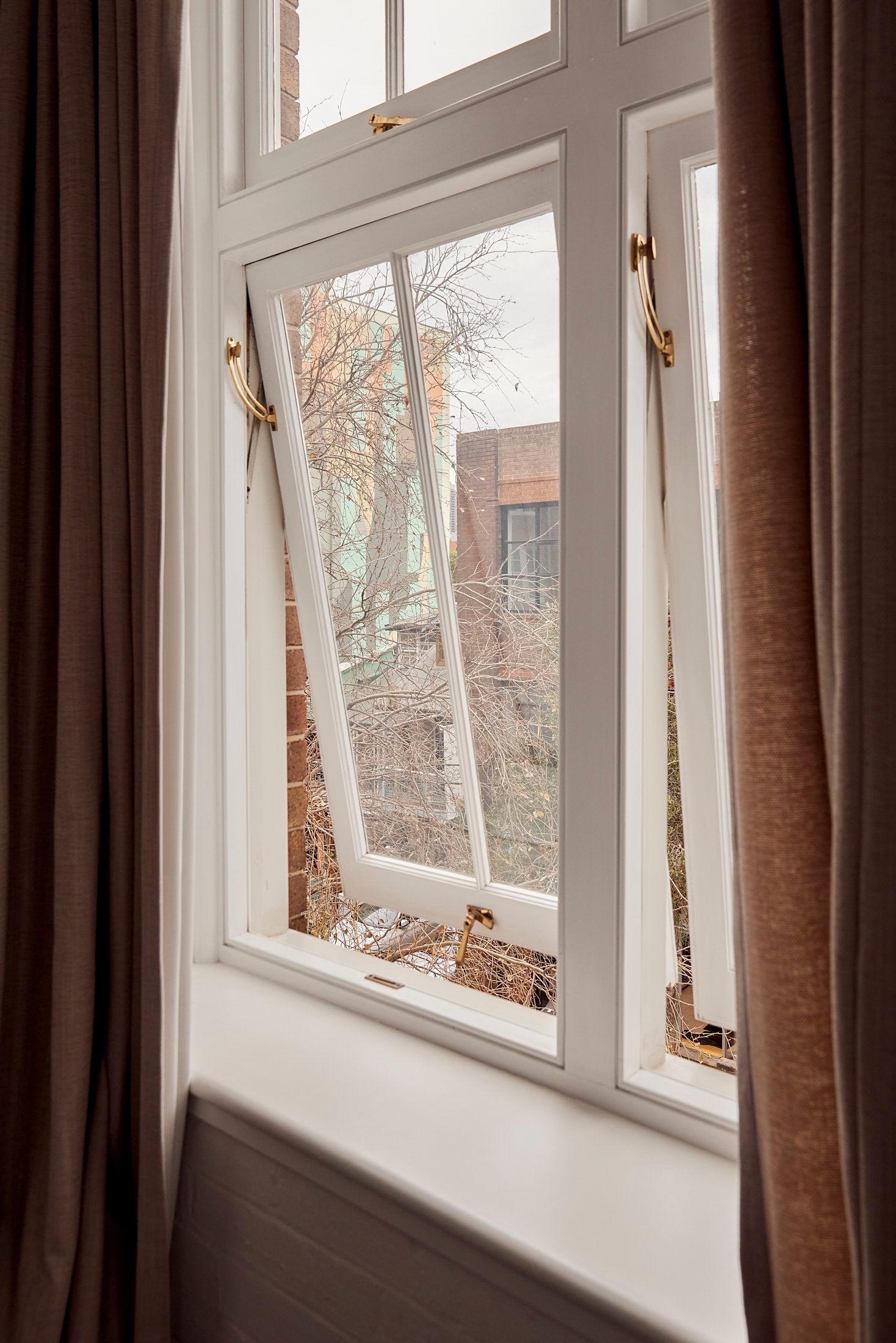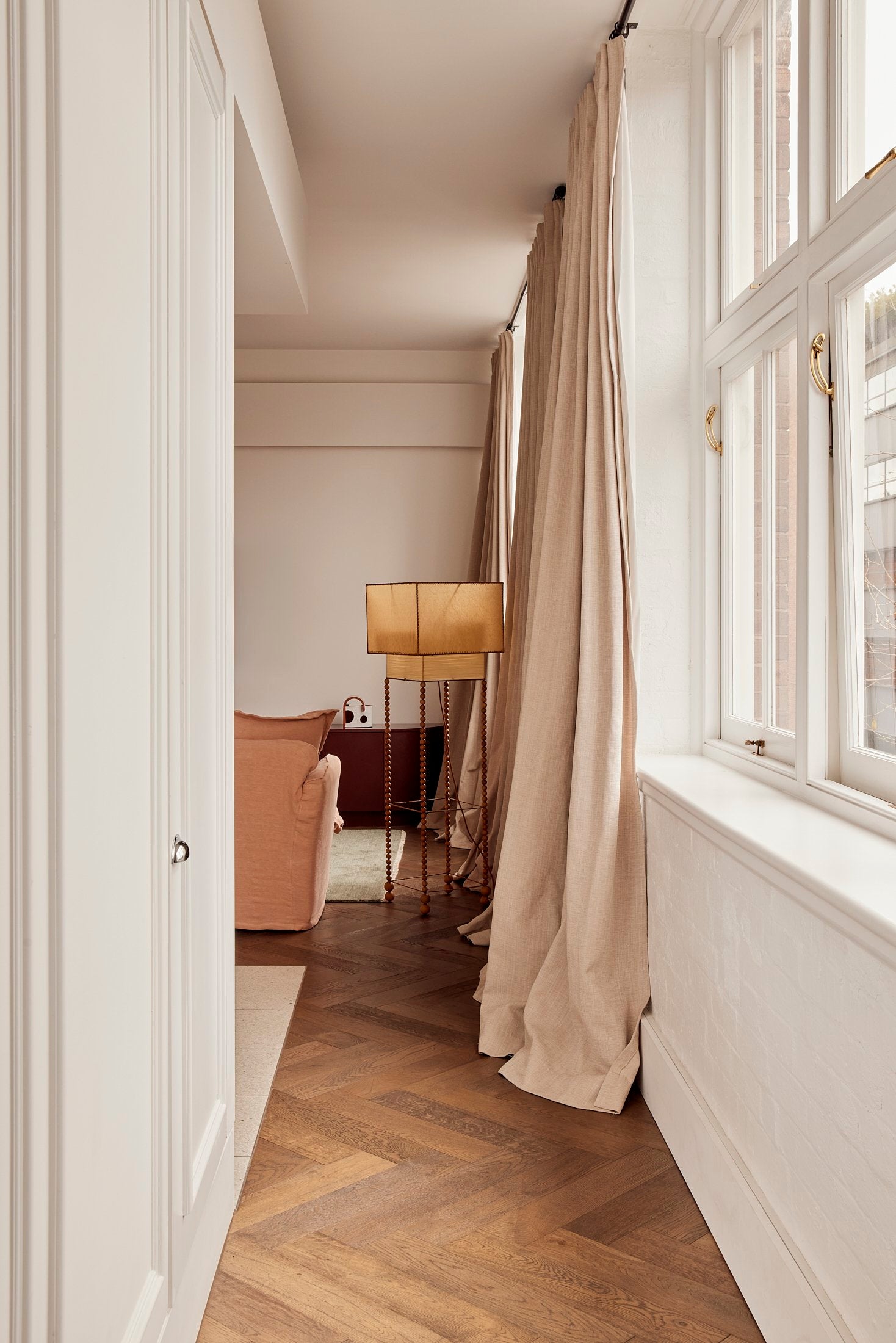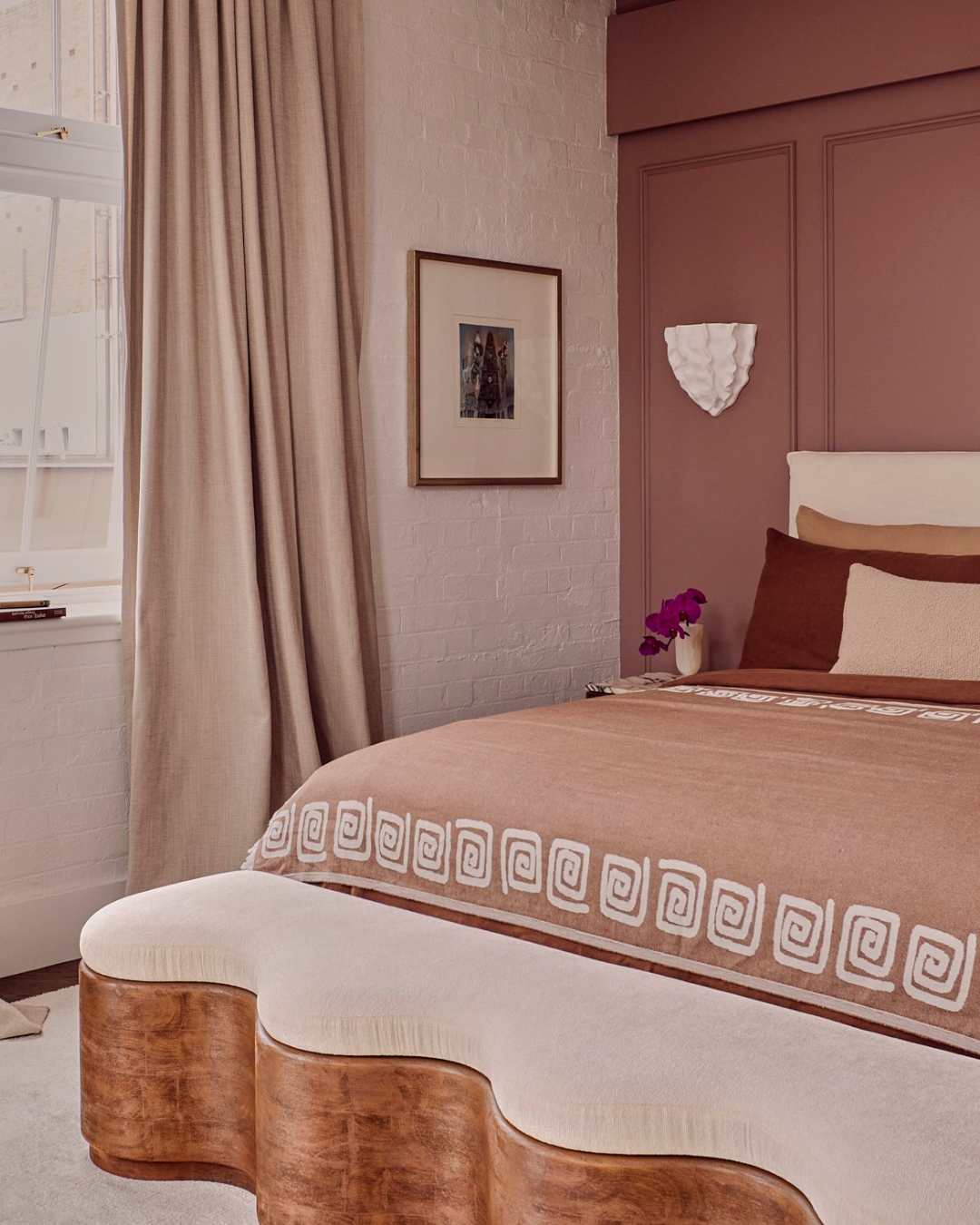 The beautiful master bedroom features our Naomi Nightstand in solid walnut timber paired with a Calacatta Viola marble top. The marble, walnut timber, herringbone flooring, and opulent draped curtains make this room effortlessly sophisticated while maintaining a distinct personality.