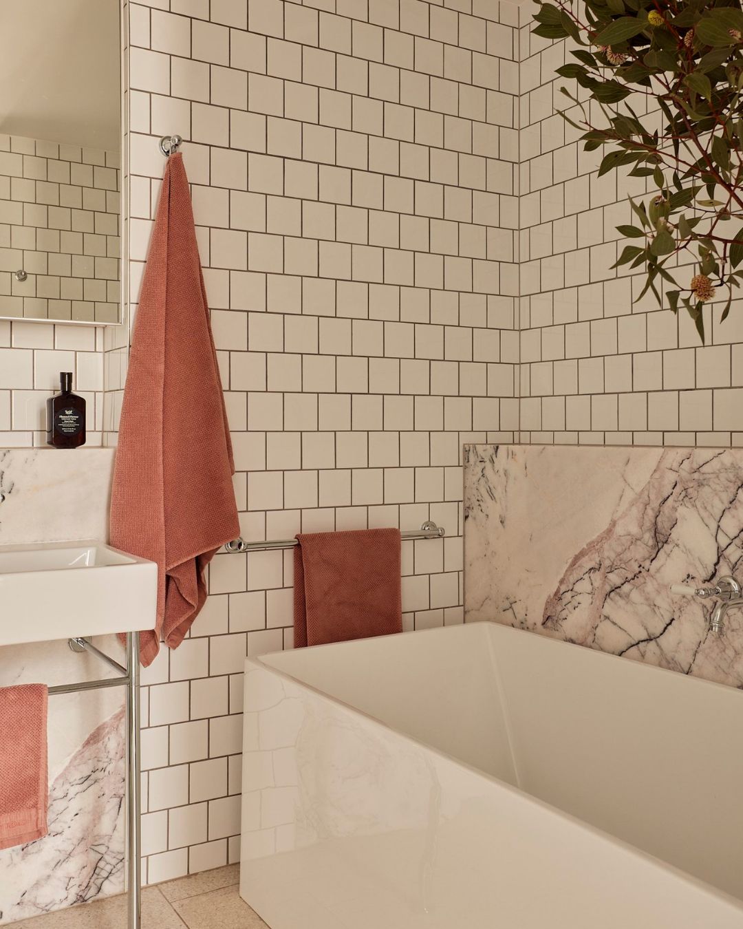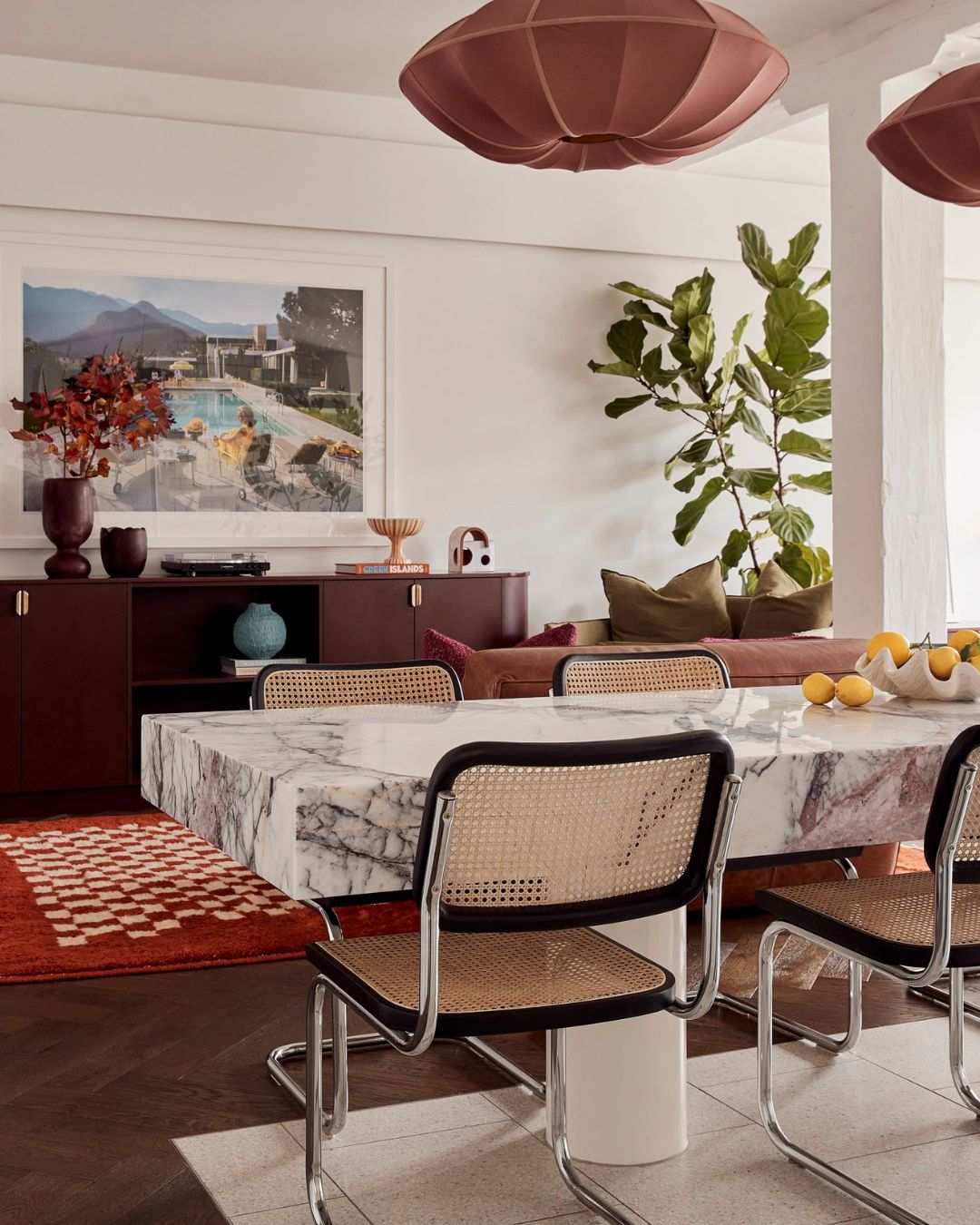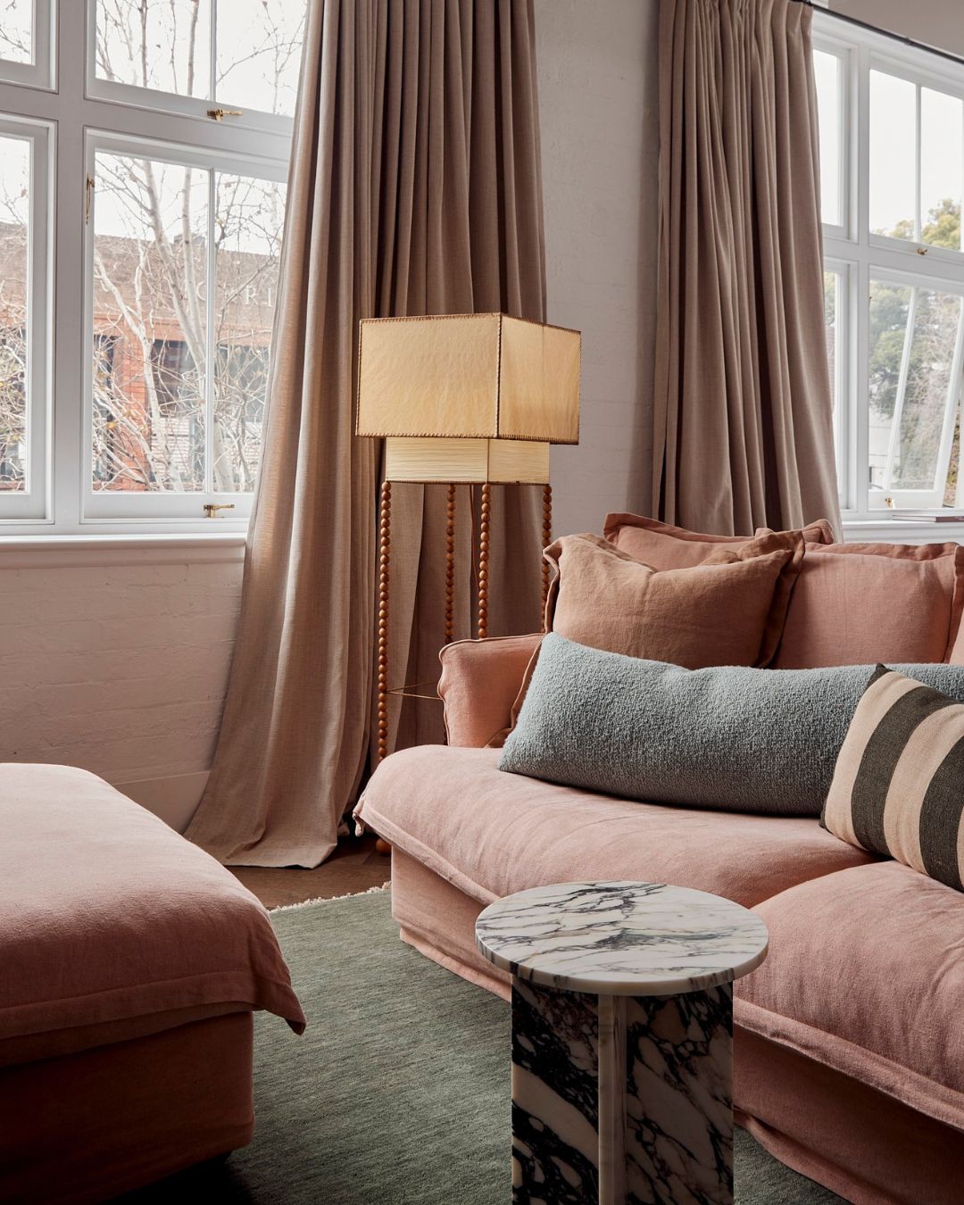 Our Franca Calacatta Viola and Cookie Rosa Levanto side tables can be seen in the living room, tying together the unique tonal palette that is seen throughout the space.