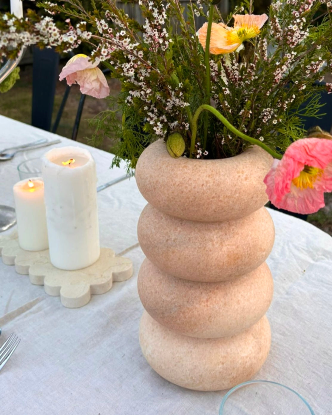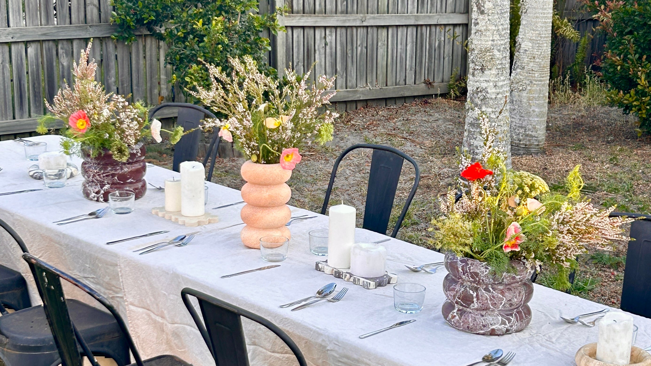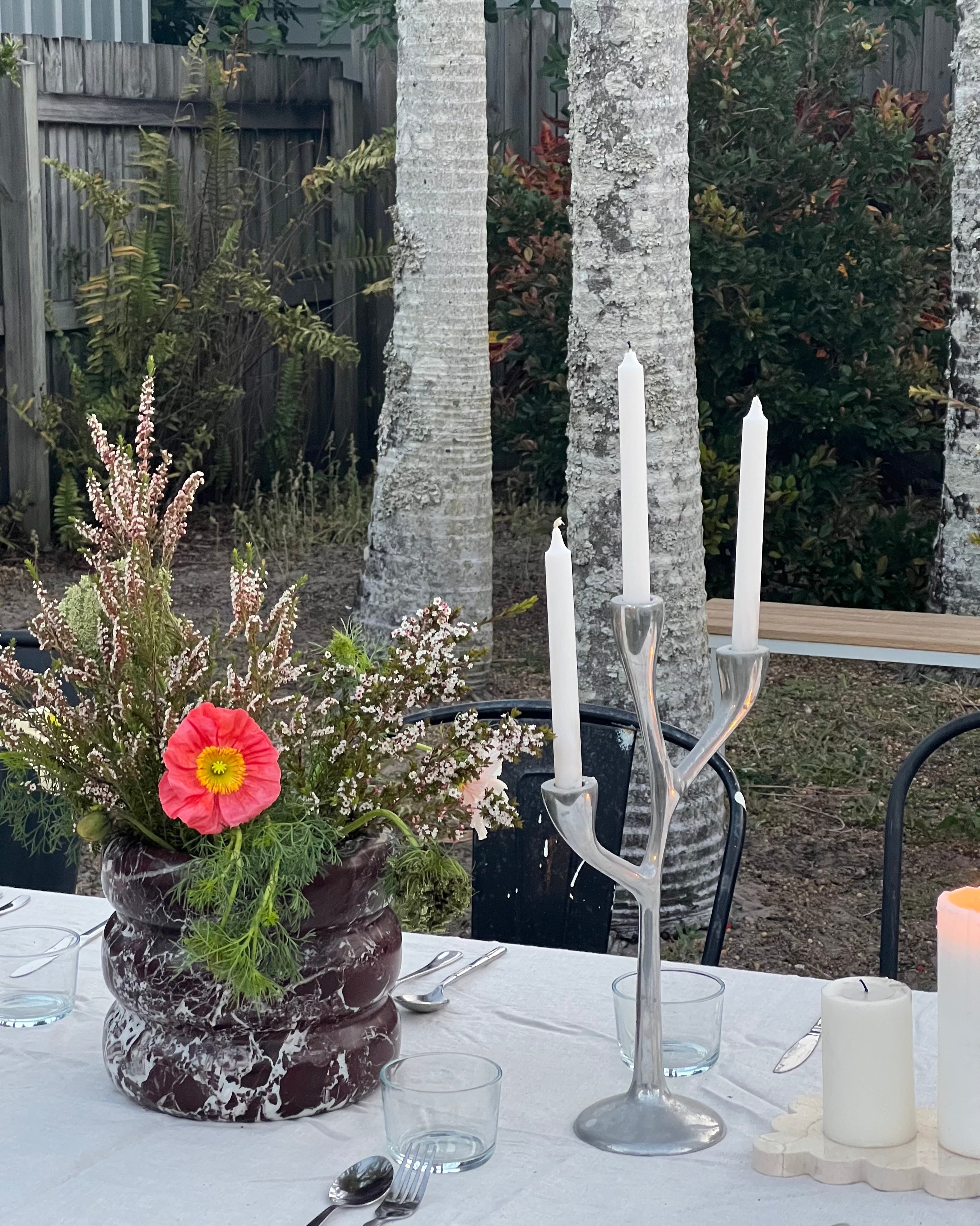 Ensure everything is spread across the table evenly, leaving room for share plates and condiments. Starting with vases, position them in a way that the table is balanced - you want to make sure all of your guests can appreciate a whiff of fresh blooms.
