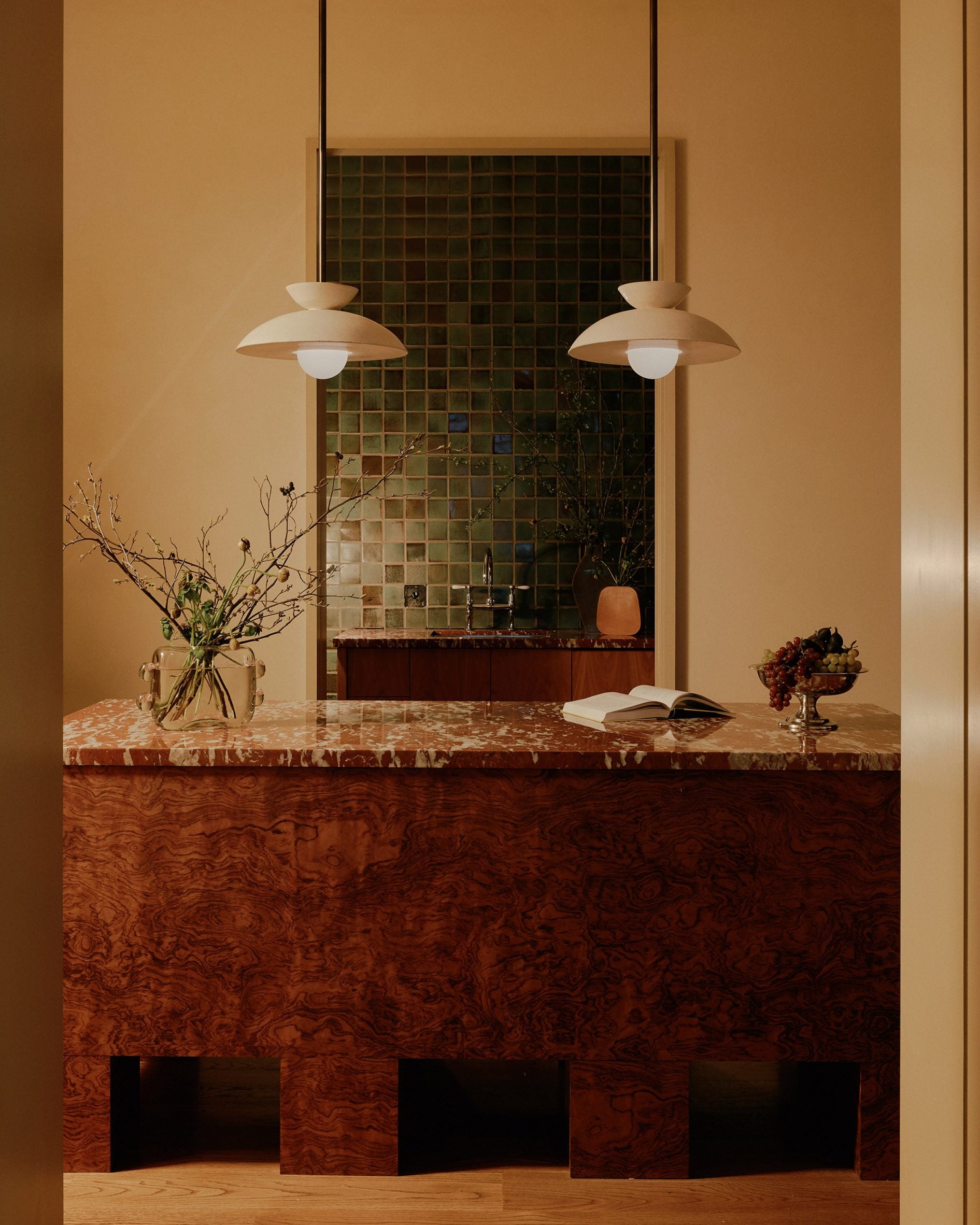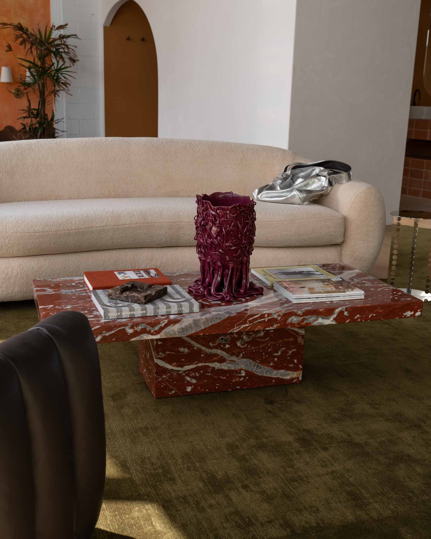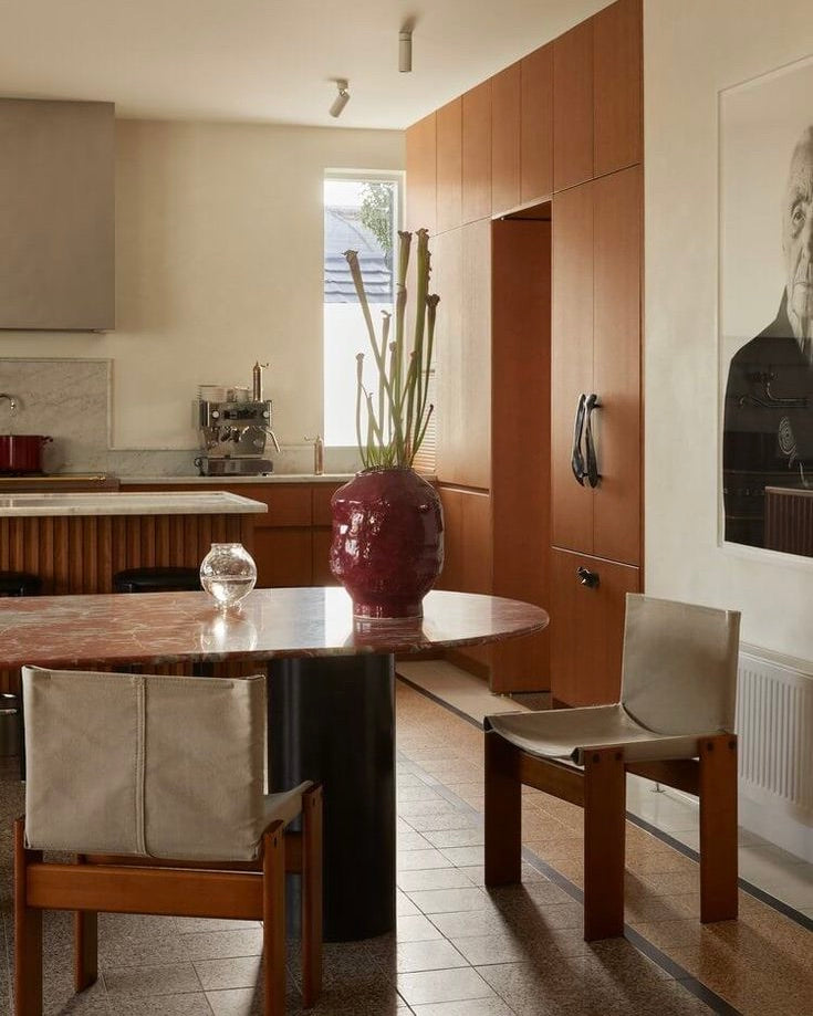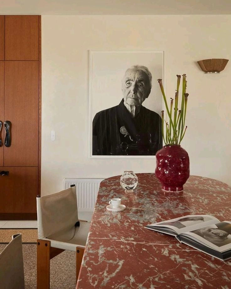 Filled with colour and light, the space features a custom Rosso Francia dining table that has taken the internet by storm.