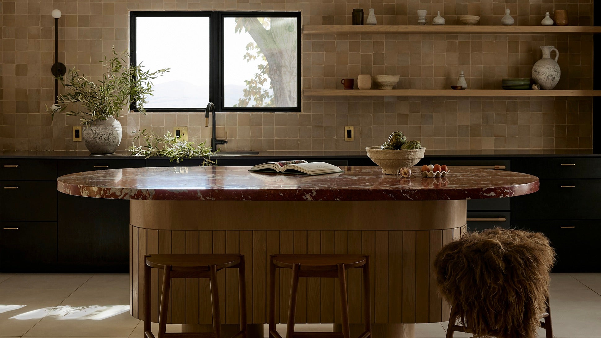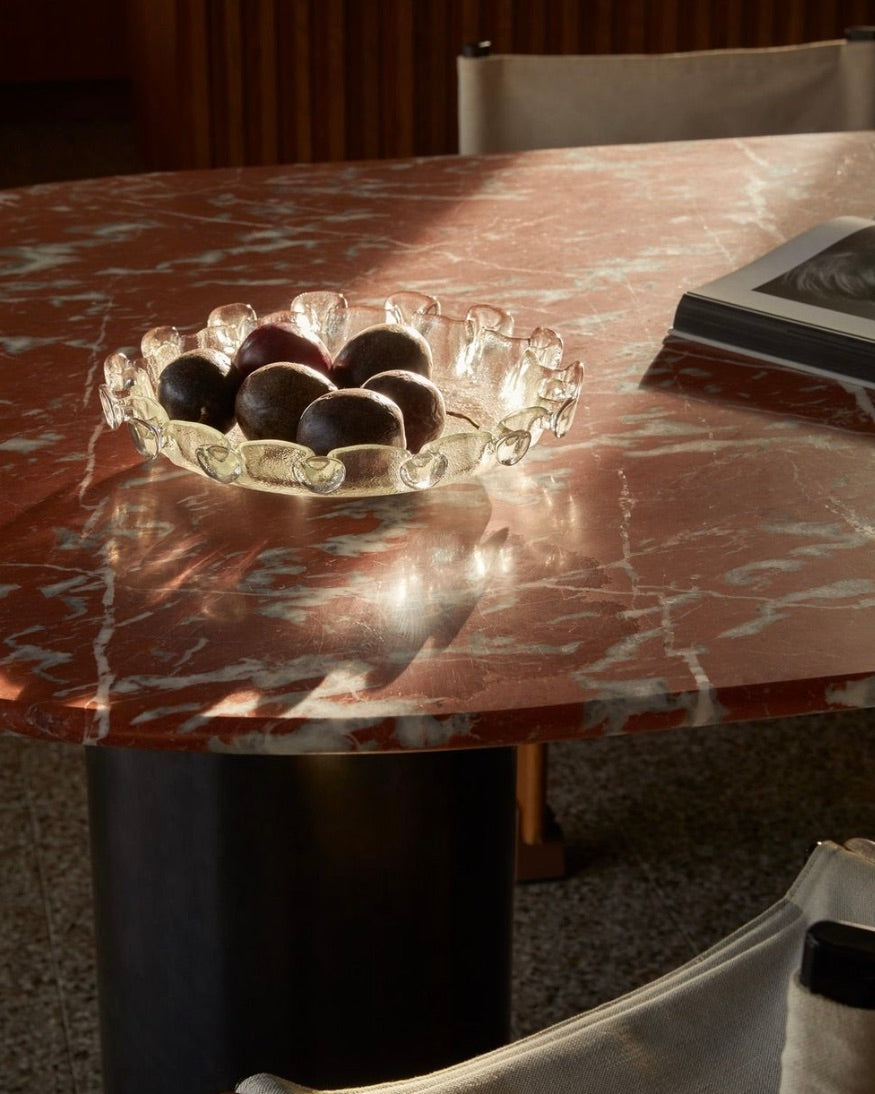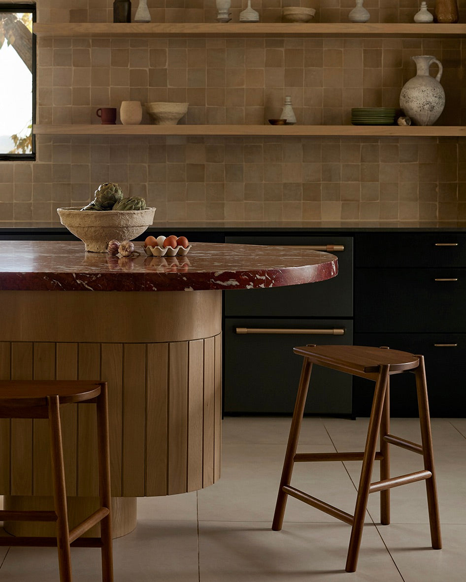 Filled with colour and light, the space features a custom Rosso Francia dining table that has taken the internet by storm.