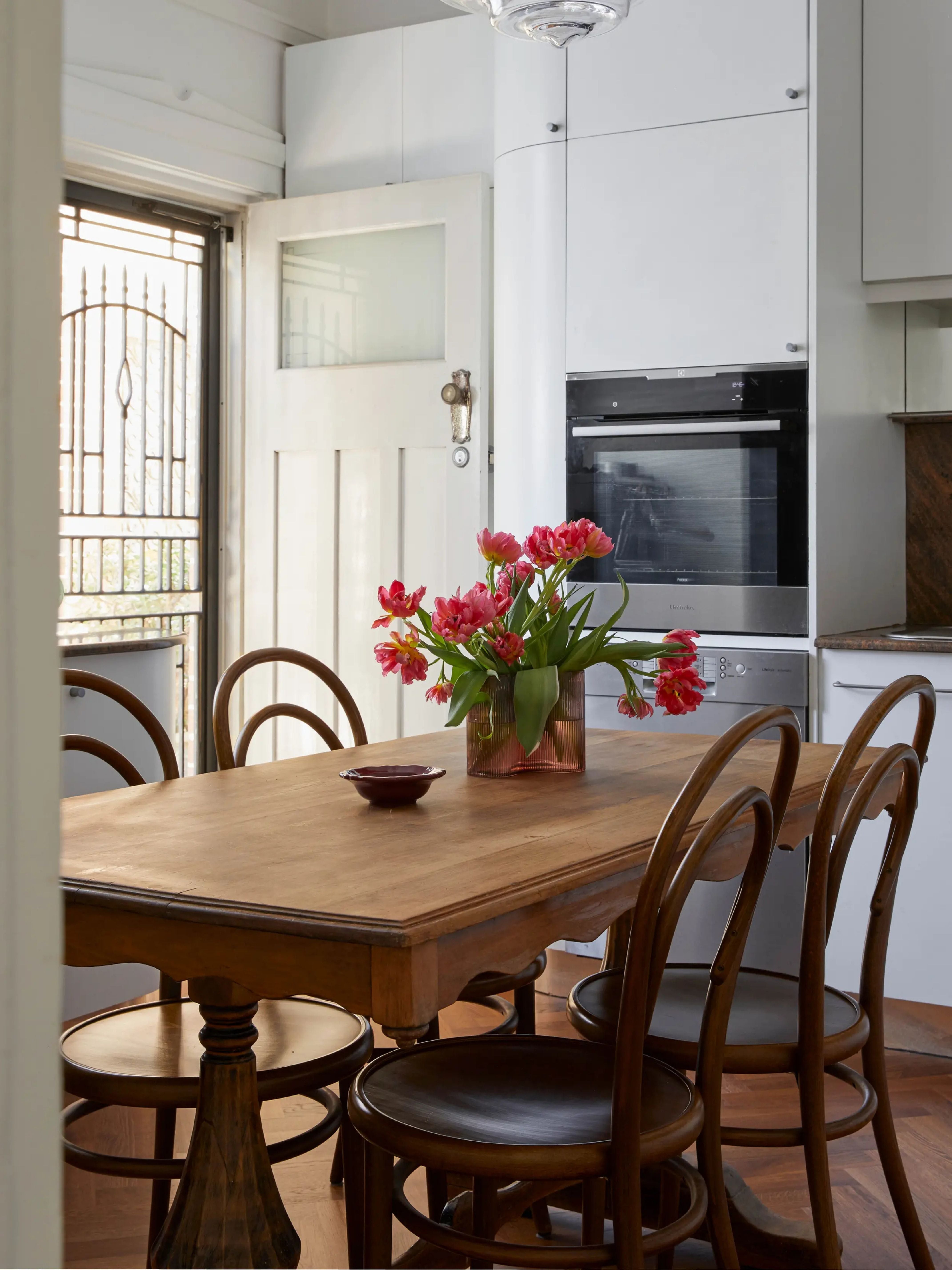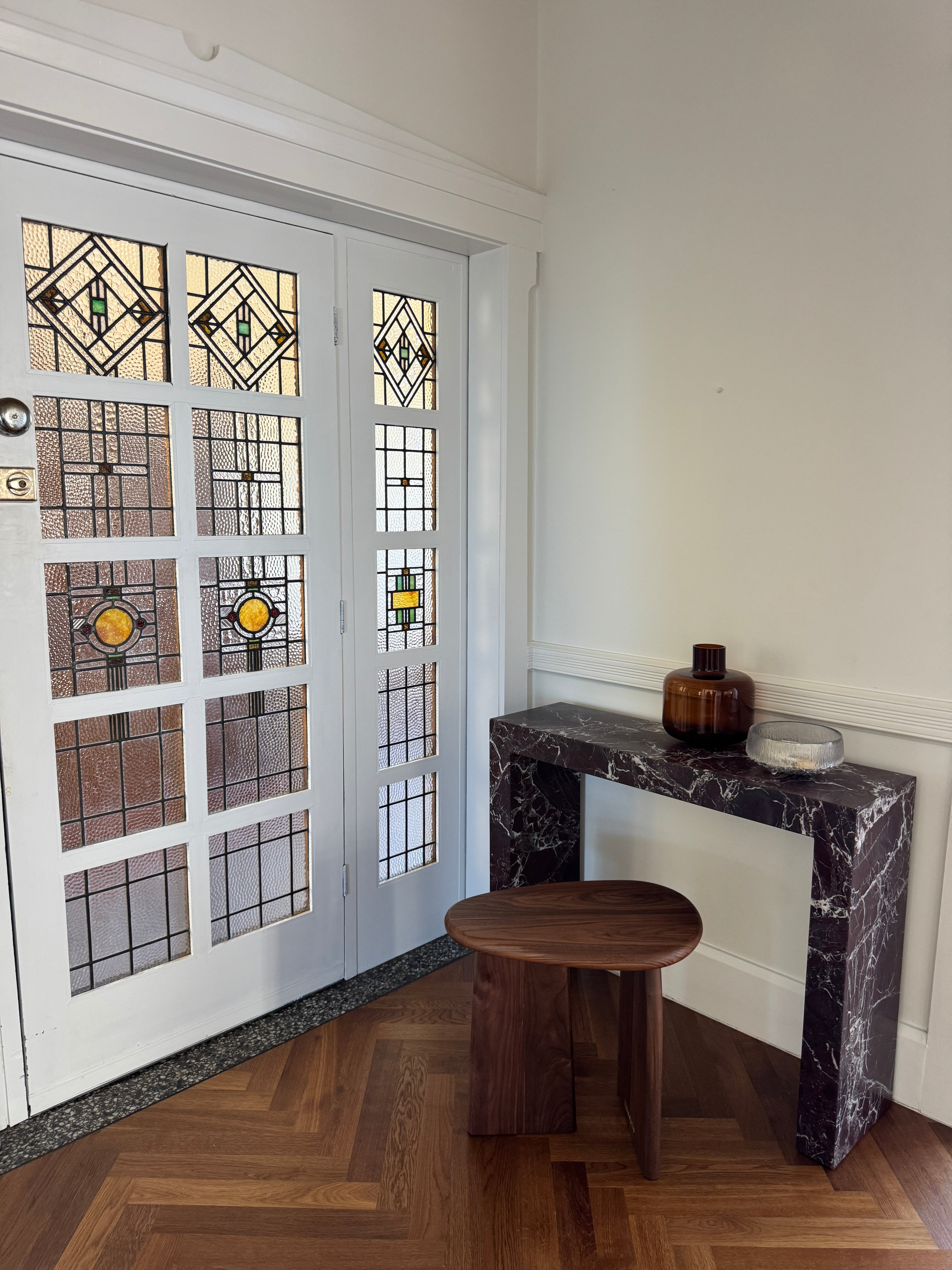 Our home is over 120 years old, so our renovation was very considered but the space needed freshness. The bones are incredible, with very high ceilings, mouldings and art deco stained glass doors and windows throughout. The biggest investment was taking up the old very damaged floor, and putting in European oak parquetry flooring. It has elevated the space beyond what we invisaged. My husband also collects mid century pieces so these look amazing back with the older elements of the space.