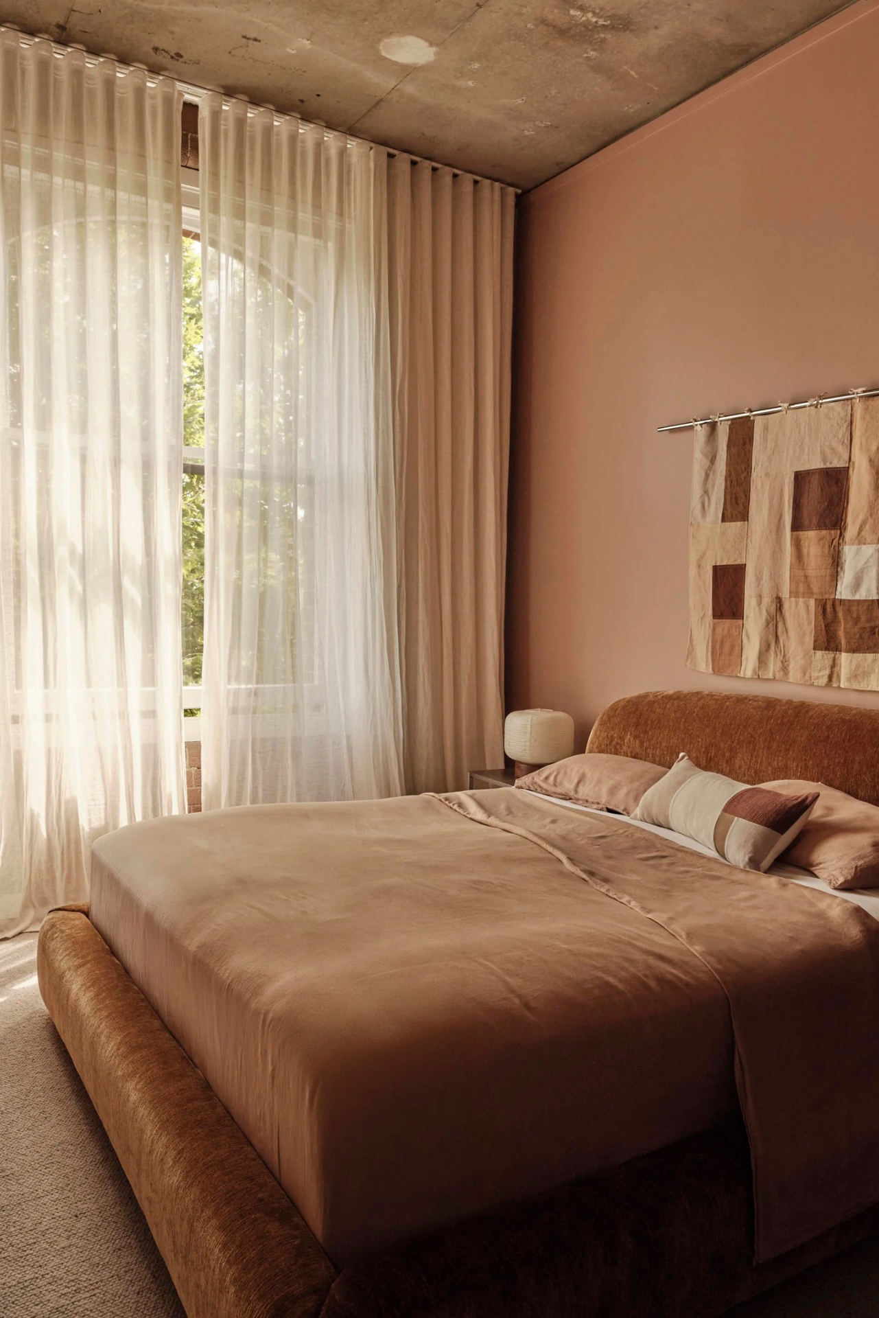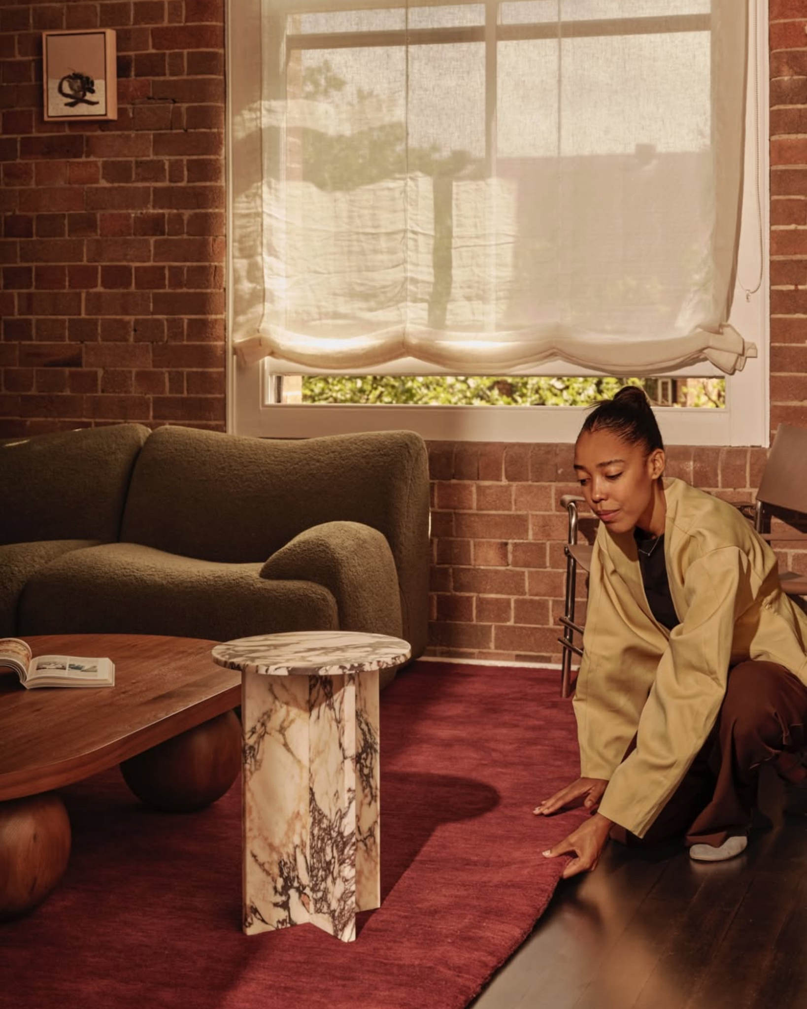 Two Fleur Studios pieces sit at the centre of the redesign: the Elio Round Dining Table, anchoring the open living space with its natural and textural beauty, and the Franca Calacatta Viola, adding depth, dimension and sculptural presence. Both pieces complement the loft’s industrial heritage while introducing an elevated, modern edge.