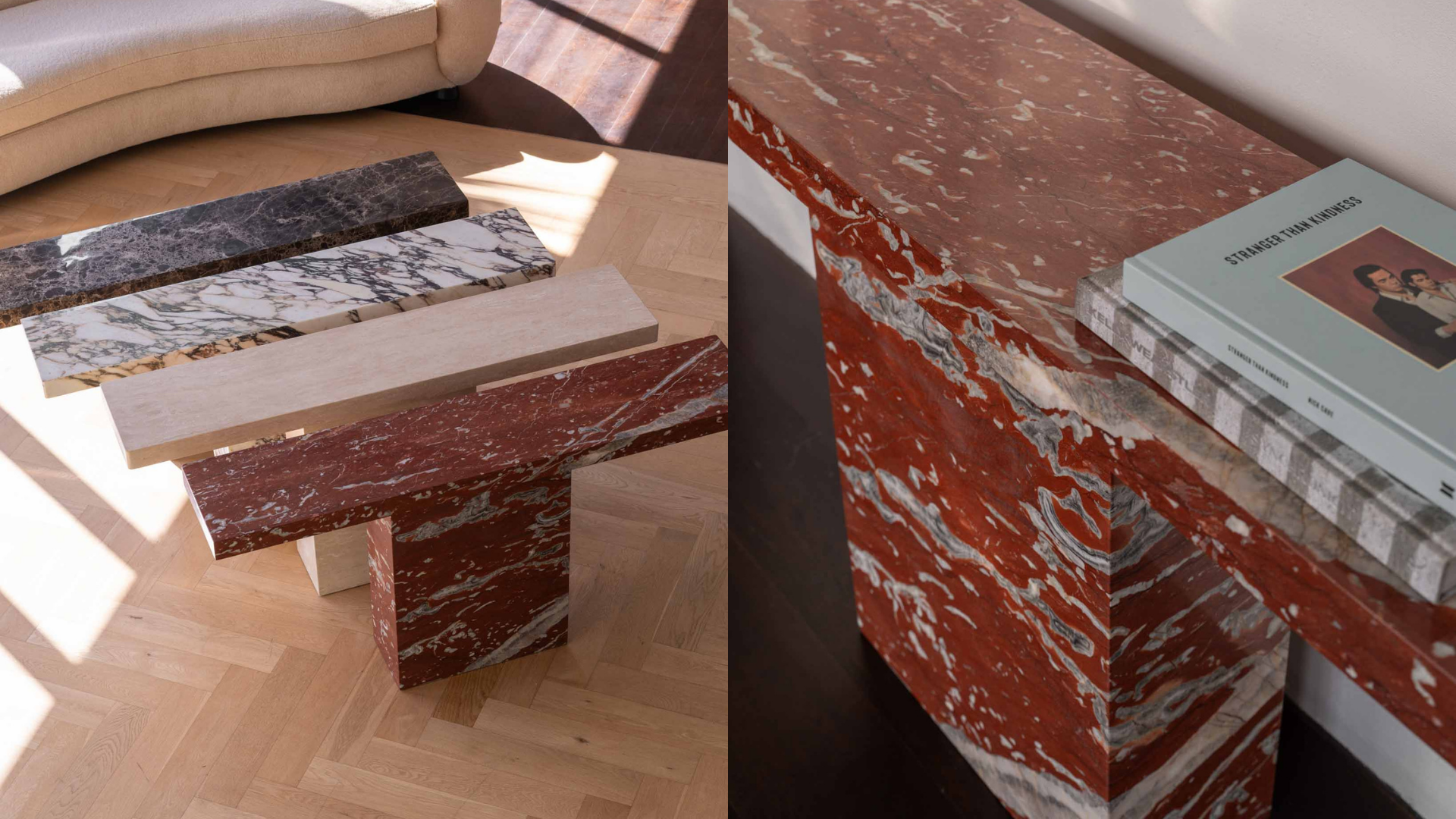 The Gino Console is crafted from four luxurious marbles, allowing you to bring the best of nature's artistry into your home or workspace. The richly veined Rosso Francia marble adds a striking statement to your space. Seen above at the Ace Hotel Sydney throughout the ground floor and lobby bar.