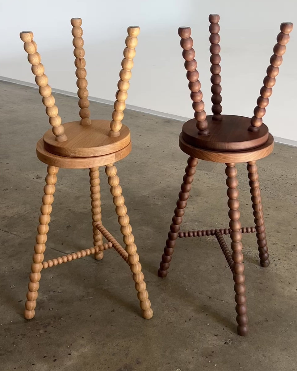 The legs start as 45mm dowel which is spun on a timber lathe to carve the unique shape, then hand finished and joined to the seat base with mortise and tenon to create the sculptural silhouette.