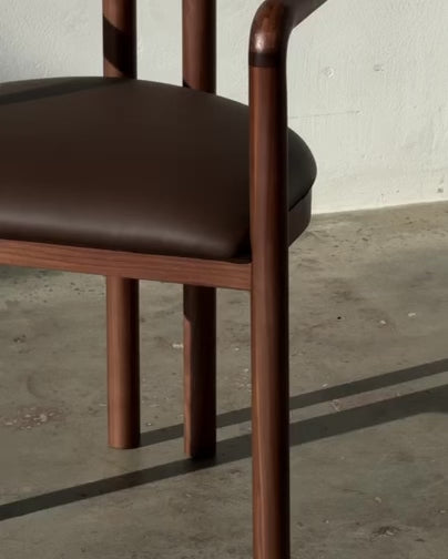 Crafted with American Walnut, the soft curves and refined silhouette are complemented by the tightly upholstered tonal chocolate leather cushion.