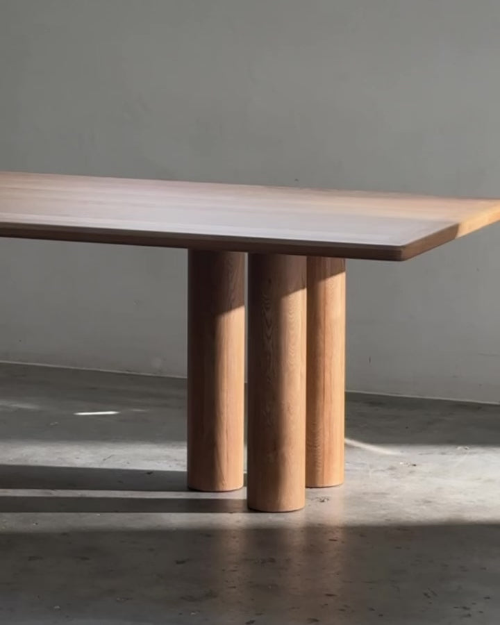 Featuring a generously sized tabletop with softly rounded edges of solid timber, revealing the timeless characteristics of timber endgrain. Paired with a trio of solid timber legs at each end.