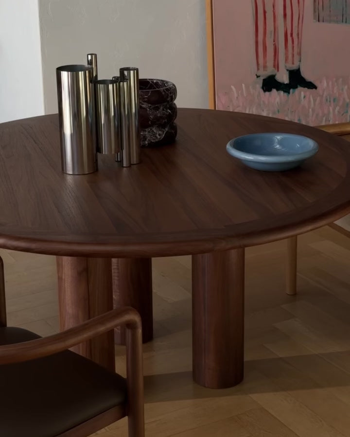 The Elio round dining table in American Walnut is the embodiment of striking simplicity. With a moody, refined aesthetic and bold silhouette, it's a contemporary centrepiece made for conversation.