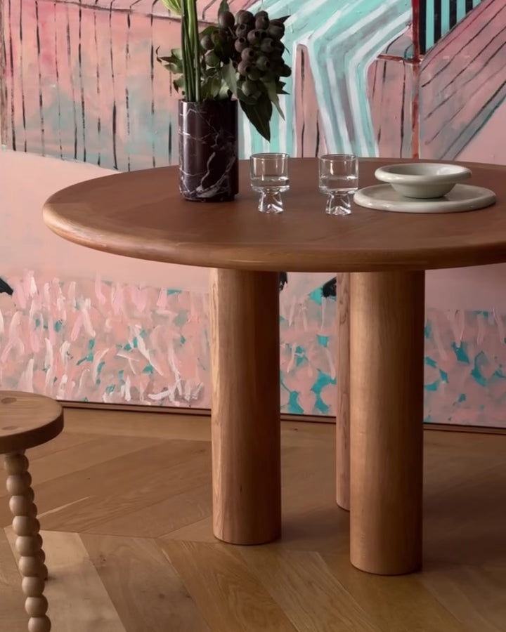 The Elio round dining table in American Oak is the embodiment of striking simplicity. With a moody, refined aesthetic and bold silhouette, it's a contemporary centrepiece made for conversation.