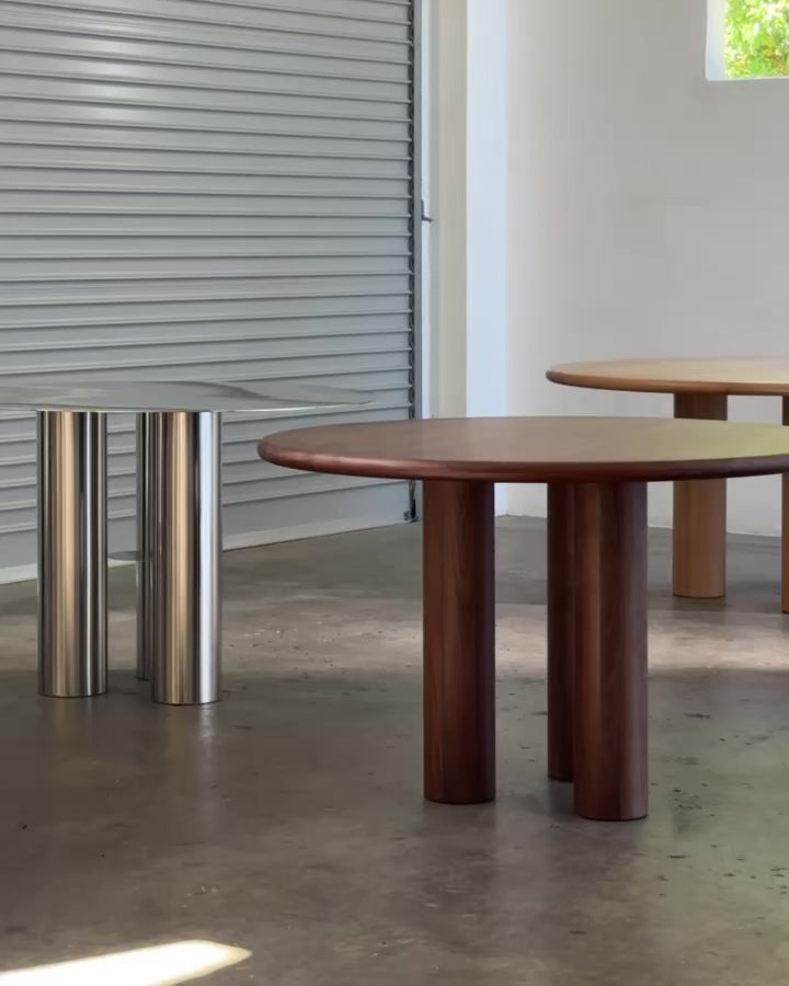 Featuring a circular tabletop with softly rounded edges of solid timber, revealing the timeless characteristics of timber endgrain. Paired with a trio of solid timber legs.